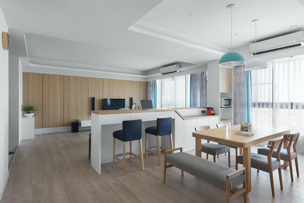 客餐廳以開放空間呈現,其中,以中島作業桌做為區隔,讓客餐廳作為全家聚集的中心。