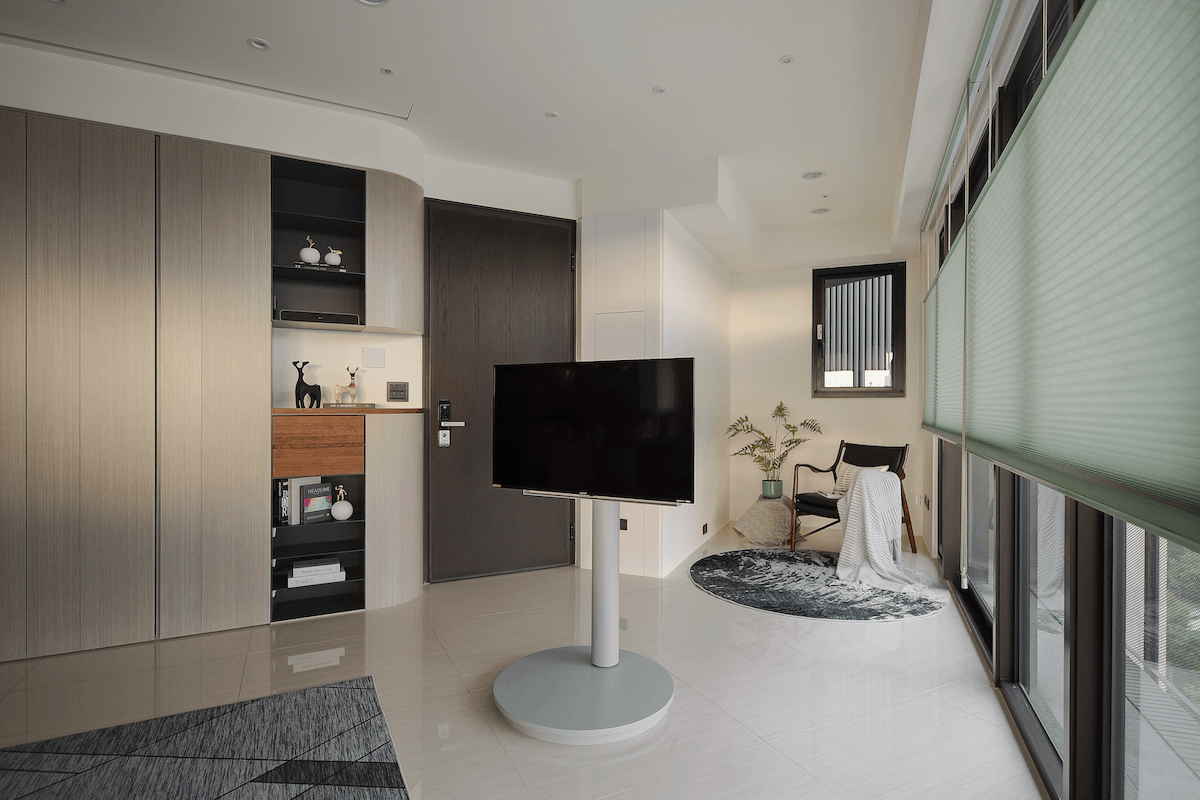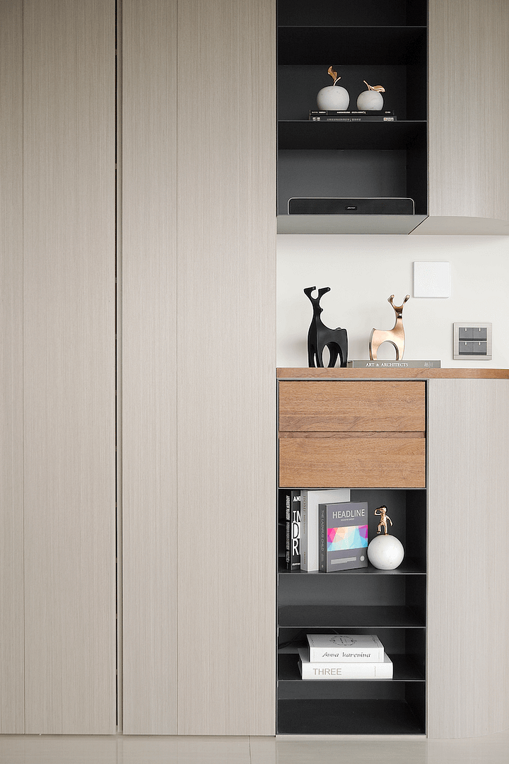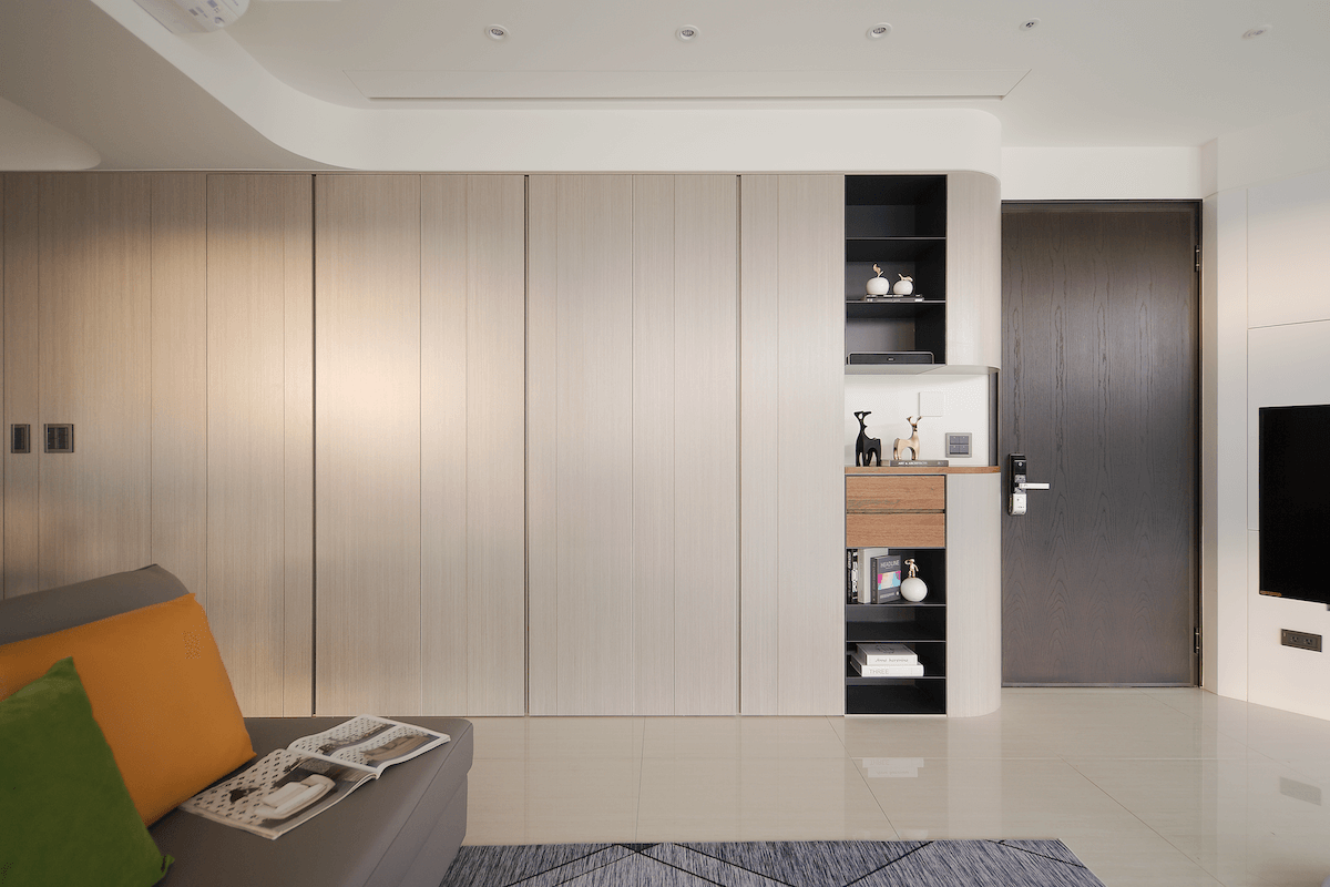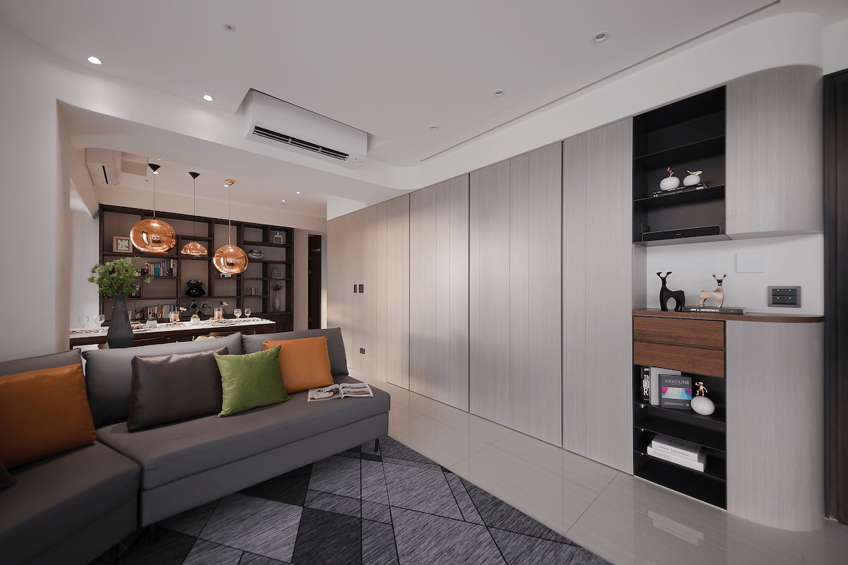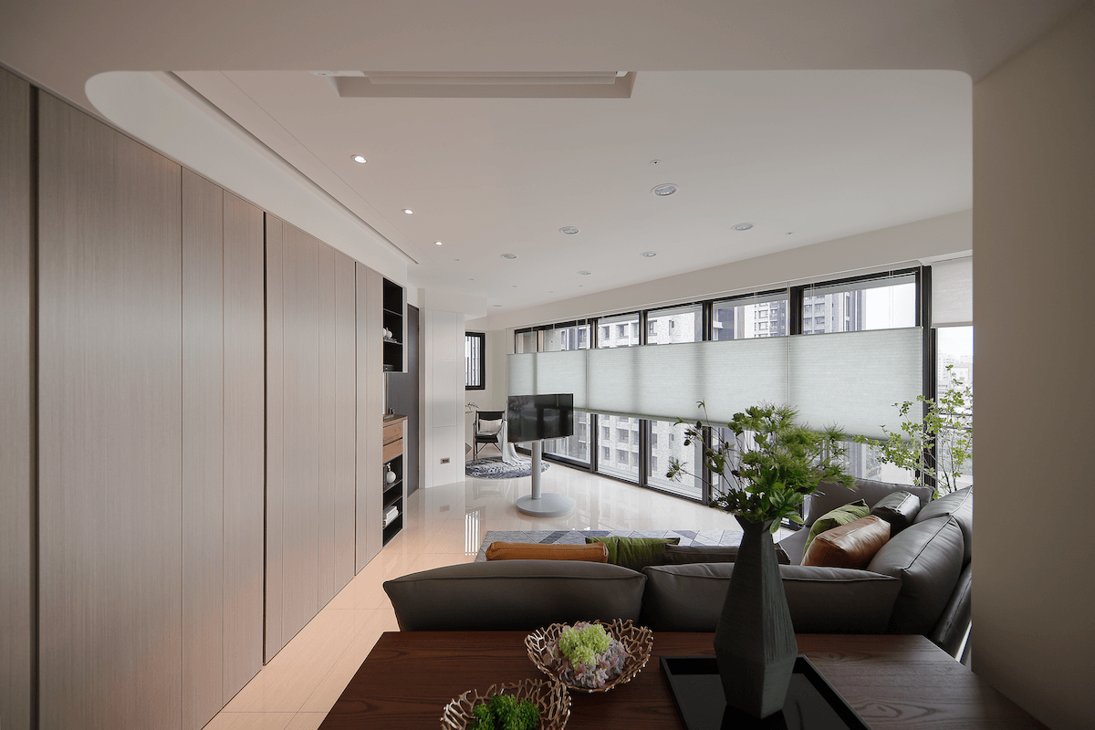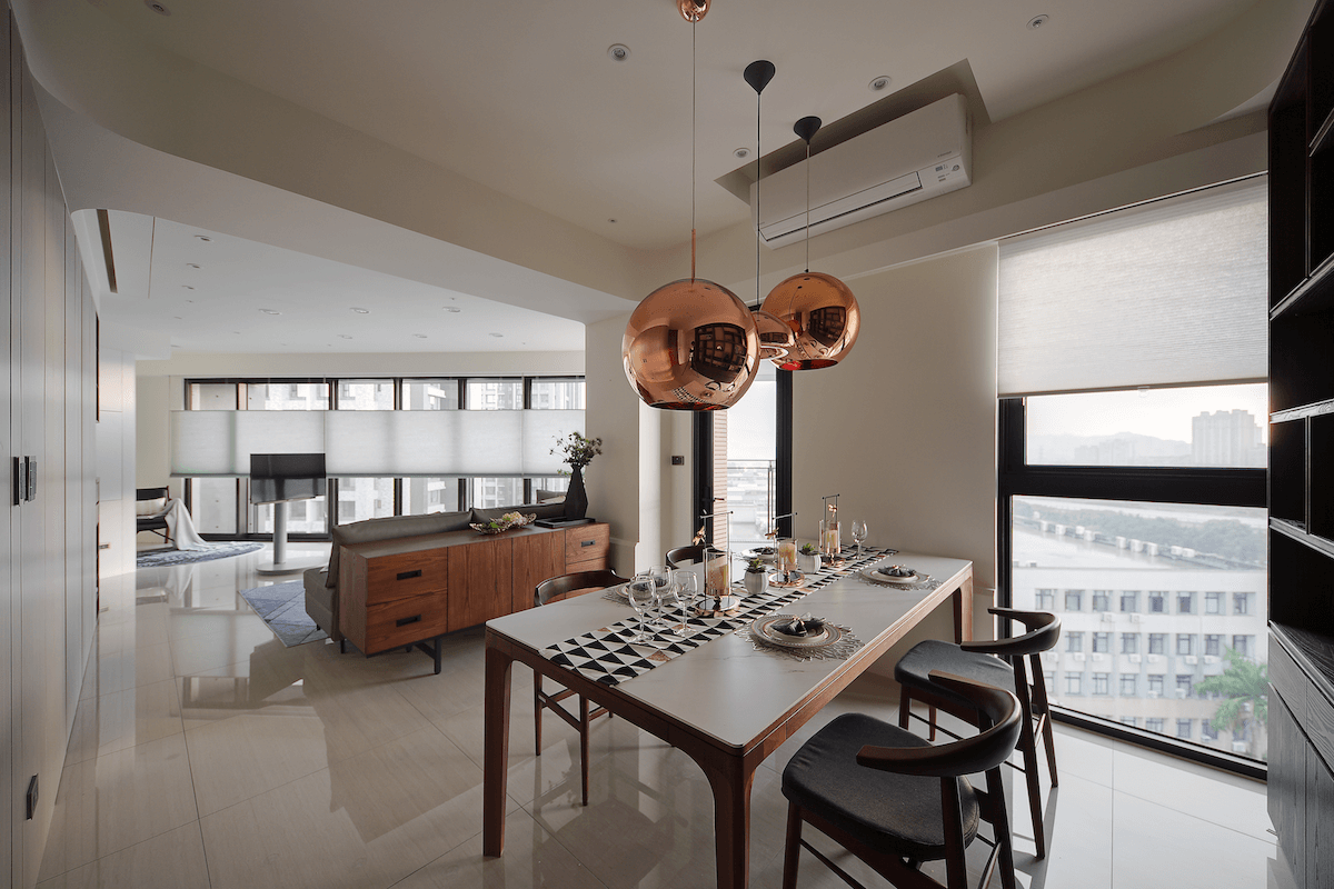 「建議餐桌由八人座改成六人座,就有空間做一個深度的串連,將客餐廳串在一起,會很大氣,廚房也用隱藏門的形式,做成與收納櫃同造形,整面牆看起來就大方。」